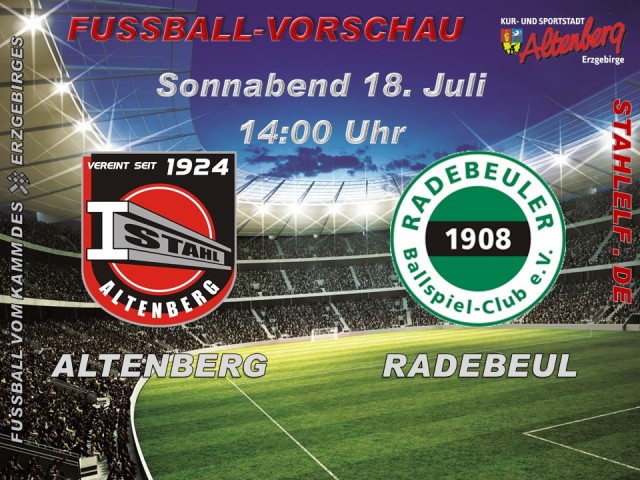 BSG Stahl Altenberg - SG Motor Wilsdruff >>Spielbericht<< SG Traktor Reinhardtsdorf - BSG Stahl Altenberg >>Spielbericht<< 12.03.2015 Das ausgefallene Heispiel der Ersten Mannschaft gegen den Heidenauer SV 2. findet am 04.04.2015 um 15 Uhr statt. Damit steht der Stahlelf ein sportliches Osterwochenende bevor, denn bereits 48 Stunden später hat man den 1.FC Pirna ebenfalls zum Nachholspiel zu Gast. 06.03.2015 Die für das Wochenende angesetzten Heimspiele der Ersten Mannschaft, B-Jugend, C-Jugend und E-Jugend müssen wegen Unbespielbarkeit des Platzes leider abgesagt werden. 01.03.2015 Mit einem dicken Ausrufezeichen ist die Erste Mannschaft in die Rückrunde gestartet. Beim klaren Favoriten Chemie Dohna gelang der Stahlelf ein 2:1 Sieg, die Torschützen waren Erik Lehmann und Petrick Fraulob. >>Spielbericht<< Mit einer unglücklichen 1:2 Niederlage kehrte die Zweite Mannschaft aus Freital zurück - ein Eigentor und eine fragwürdige Elfmeterentscheidung kurz vor Schluss kosteten einen Punktgewinn bei der SG Weißig II. Torschütze zum zwischenzeitlichen 1:1 für die Stahlelf war Sven Grundig. Das Spiel der F-Jugend in Rabenau ist ausgefallen. 09.02.2015 Das Testspiel der Ersten Mannschaft beim 1.FC Pirna 2. wurde mit 2:4 verloren. 13.01.2015 Das Anfang Dezember wegen dichten Nebel ausgefallene Spiel der Ersten Mannschaft gegen den 1.FC Pirna wird am Ostermontag, den 6.April, um 15 Uhr nachgeholt. 13.01.2015 Die Männermannschaft ist in der Vorrunde der Hallenkreismeisterschaft 2015 gescheitert. Nach zwei standesgemäßen Auftaktsiegen gegen die Kreisligisten SG Kesselsdorf (5:0) und SV Struppen (6:2) setzte es im dritten Gruppenspiel gegen Ost-Kreisligisten SG Ullersdorf eine unnötige 1:3 Pleite. So war man im letzten Spiel gegen den Favoriten Hainsberger SV im Zugzwang, verlor die turbulente Partie letztlich aber klar mit 2:5. Somit zogen neben den Hainsbergern noch die Ullersdorfer in die Finalrunde am 24.Januar ein. Die Stahlelf spielte mit: Tim Kaden, Björn Eberth, Martin Vogel, Steve Bigalke, Tobias Liebscher, Nick Siegemund, Robby Müller 06.12.2014 Beide Spiele der Männermannschaften mussten am Nikolaustag wegen dichtem Nebel abgesagt werden. Die Nachholtermine werden bekannt gegeben, sobald sie feststehen. Vereinsergebnisse 15.11.-19.11.2014 SpG Possendorf/Kreischa - B-Jugend 8:1 SpG Schlottwitz/Glashütte/Liebstadt - C-Jugend 4:2 Hartmannsdorfer SV Empor - E-Jugend 7:1 F-Jugend - SG 90 Braunsdorf 7:2 SpG Bärenstein/Glashütte/Schlottwitz - B-Jugend 6:1 SV Sachsen Müglitztal AH - Alte Herren 0:5 Pechvogel im Spiel der Alten Herren war Marko Walther, der zum zweiten Mal innerhalb von eineinhalb Jahren einen Achillessehnenriß erlitt. Kopf hoch und gute Besserung Mäcki. Vereinsergebnisse 08.-09.11.2014 SV Pesterwitz - Erste Mannschaft 1:4 >>Spielbericht<< SG Empor Possendorf - Zweite Mannschaft 8:2 SpG Stolpen/Schönfeld - B-Jugend 7:1 C-Jugend - LSV Gorknitz 3:6 E-Jugend - SG Grumbach 4:1 Höckendorfer FV - F-Jugend 13:0 Vereinsergebnisse 01.11.-02.11.2014 Erste Mannschaft - Hartmannsdorfer SV Empor 2:1 >>Spielbericht<< Zweite Mannschaft - Hartmannsdorfer SV 2. 3:3 B-Jugend - SV Wacker Mohorn 0:3 Hainsberger SV 3. - E-Jugend 0:11 SG Grumbach - F-Jugend 4:1 29.10.2014 Beide Männermannschaften gingen bei Motor Freital als Verlierer vom Platz. Die Zweite Mannschaft unterlag der Freitaler Reserve mit 2:4, die Erste Mannschaft verlor gar 0:4. >>Spielbericht<< 19.10.2014 Die Erste Mannschaft hat das Heimspiel gegen die SG Wurgwitz 3:4 verloren, dabei eine zwischenzeitliche 3:1 Führung leichtfertig verspielt. >>Spielbericht<< Ergebnisse vom 11.10.2014 SG Motor Wilsdruff - Erste Mannschaft 6:0 (Kreispokal) >>Spielbericht<< SV Blau-Gelb Stolpen - C-Jugend 5:2 E-Jugend - SV Blau-Weiß Glashütte 2. 10:0 F-Jugend - TSV Reinhardtsgrimma 1:0 Das Spiel der B-Jugend bei der SpG Langburkersdorf/Sebnitz musste auf rund zu vieler krankheitsbedingter Ausfälle abgesagt werden. Ergebnisse vom 04.10. - 05.10.2014 VfL Pirna-Copitz 2. - Erste Mannschaft 2:0 >>Spielbericht<< SV Hermsdorf - Zweite Mannschaft 4:0 B-Jugend - SG Wurgwitz 0:3 (Kreispokal) E-Jugend - SV Wacker Mohorn 1. 5:4 n.V. (Kreispokal) F-Jugend - TSV Kreischa 0:7 Ergebnisse vom 24.09. - 28.09.2014 Erste Mannschaft - Hainsberger SV 1:1 >>Spielbericht<< Zweite Mannschaft - VS Limbach 2:2 B-Jugend - SpG Graupa/VfL Pirna-Copitz 2. 1:1 C-Jugend - SpG Pretzschendorf/Hermsdorf/Dorfhain 1:5 SV Bannewitz 2. - E-Jugend 5:2 E-Jugend - SG Motor Freital 3:2 SG Kesselsdorf 2. - F-Jugend 27:0 Das Spiel der B-Jugend bei der SpG Bärenstein/Glashütte/Schlottwitz ist auf den 19.11., 11 Uhr verlegt wurden. 22.09.2014 Ausschliesslich Niederlagen setzte es am vergangenen Wochenende für die Teams der Stahlelf. Während bei den Männermannschaften schwierige Auswärtsspiele auf dem Programm standen, muss man bei den Jugendmannschaften fairerweise sagen, dass alle Teams als junger Jahrgang, der großteils noch eine Altersklasse weiter unten spielen könnte, neu in ihren Spielklassen sind bzw. ganz neu angefangen haben. Die Erste Mannschaft verkaufte sich beim Tabellenführer SG Motor Wilsdruff teuer, verlor aber letztlich doch zu deutlich mit 0:5. >>Spielbericht<< Einen katastrophal beschämenden Auftritt absolvierte die Zweite Mannschaft bei der Reserve des SV Bannewitz. Ohne Biss, Einsatz und Teamgeist ging man mit 0:9 unter. Die B-Jugend verlor bei der SpG Rabenau/HöckendorfSeifersdorf mit 0:4. Die C-Jugend unterlag in ihrem ersten Heimspiel gegen den TSV Kreischa mit 0:3. Die E-Jugend verlor gegen die SG Empor Possendorf mit 3:8. Die neu gegründete F-Jugend musste sich beim TSV Seifersdorf mit 3:20 geschlagen geben. 15.09.2014 DIe Erste Mannschaft verlor ihr zweites Heimspiel gegen die SG Reinhardtsdorf mit 2:3. >>Spielbericht<< Überschattet wurde die Partie von einer schweren Verletzung von Marcus Kaufmann, der der Stahlelf voraussichtlich lange Zeit fehlen wird. Kopf hoch und gute Besserung Marcus! Die Zweite Mannschaft konnte ihr Heimspiel 